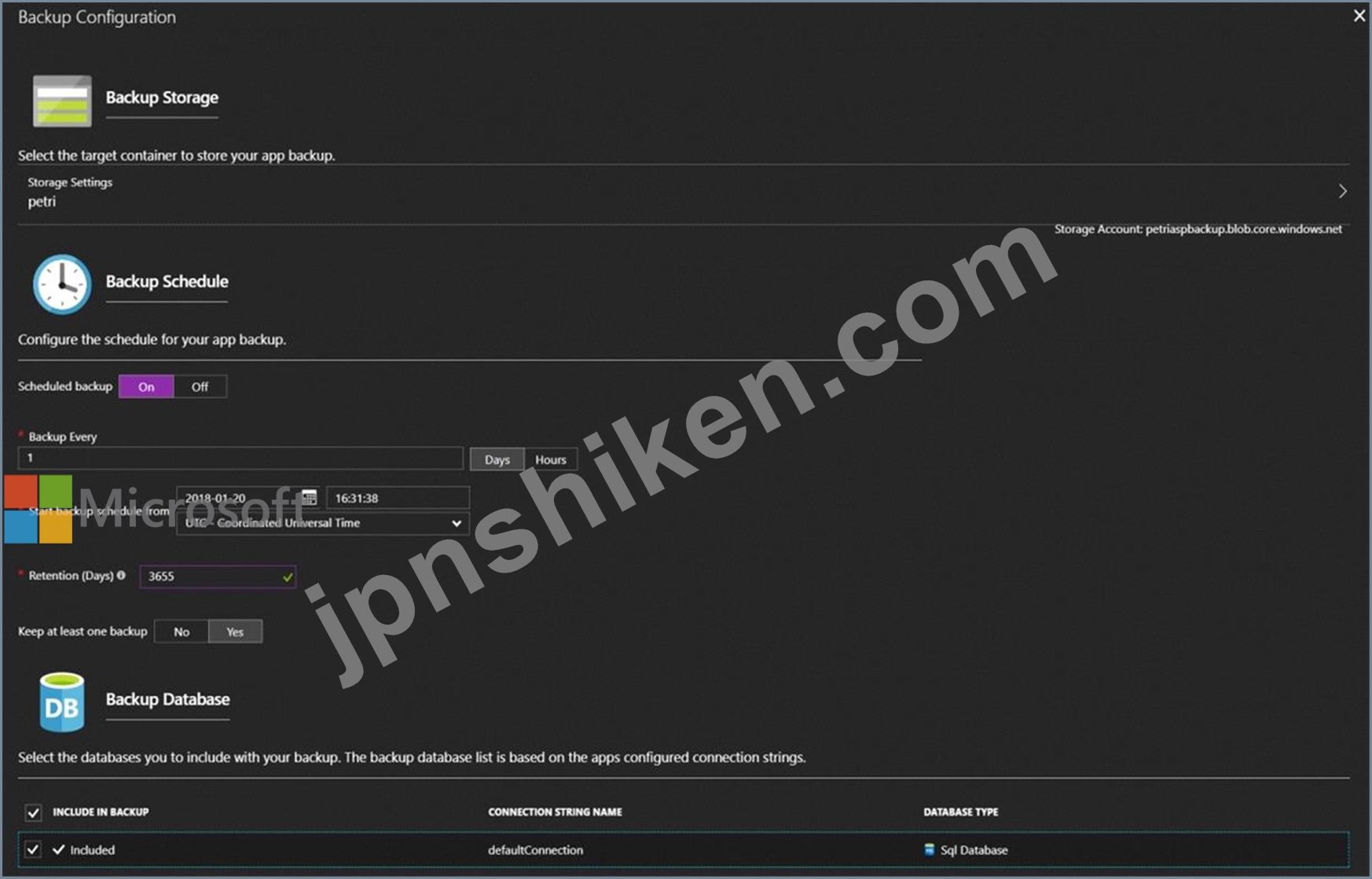 With the storage account ready, you can configure backs up in the web app or App Service.