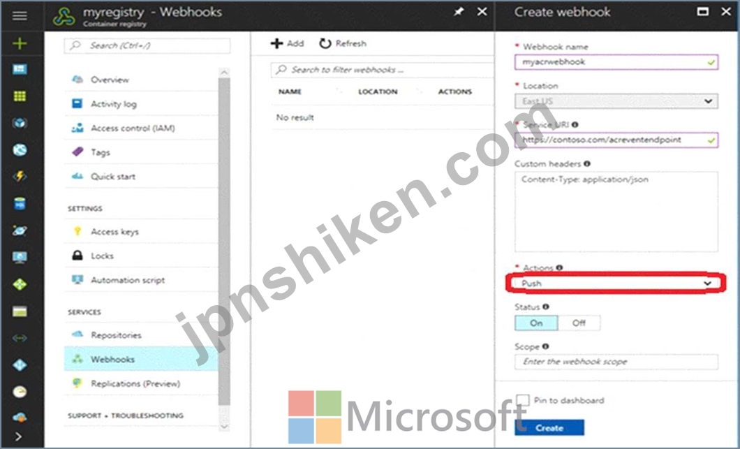 See solution below. Explanation: * Sign in to the Azure portal. * Navigate to the container registry az40010480345acr1. * Under Services, select Webhooks. * Select the existing webhook https://contoso.com/statushook, and double-click on it to get its properties. * For Trigger actions select image push Example web hook: Reference: https://docs.microsoft.com/en-us/azure/container-registry/container-registry-webhook