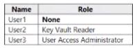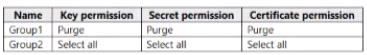 パージ保護が無効に設定されているVault1という名前のAzureキーボールトがあります。 Vault1には、次の表に示すアクセスポリシーが含まれています。