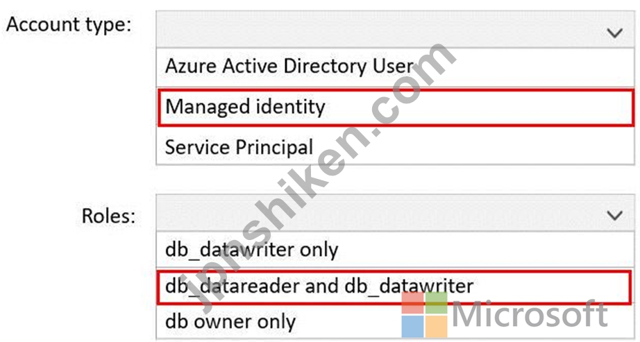 Which type of account should App1 use to access SQL1, and which database roles should you assign to App1? To answer, select the appropriate options in the answer area.