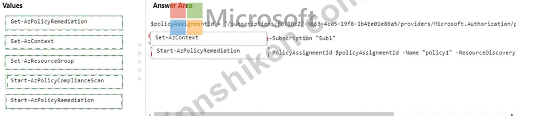 Authorization/f Value Set-AzContext -Subscription "Sub1" Value Start-AzPolicyRemediation - PolicyAssignmentld $policyAssignmentId -Name "policy1" -ResourceDiscovery