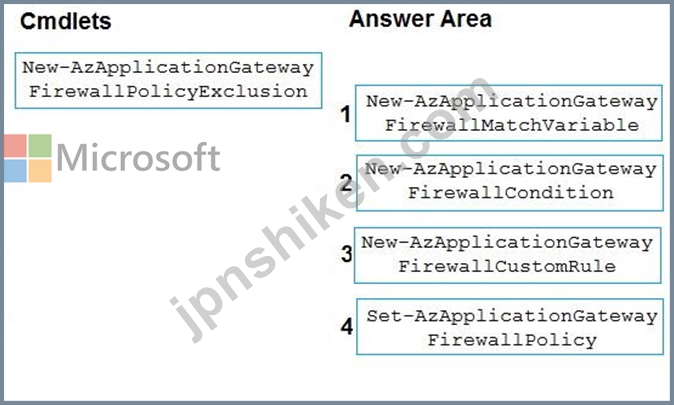 どの 4 つの PowerShell コマンドレットを順番に実行する必要がありますか? 回答するには、適切なコマンドレットをコマンドレットのリストから回答領域に移動し、正しい順序に並べます。