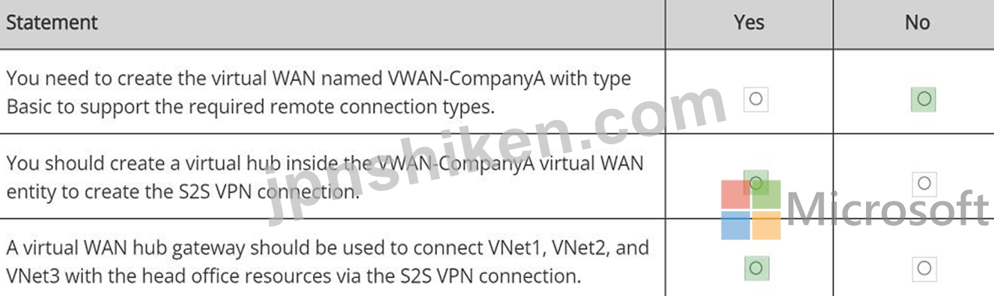 You do not need to create the virtual Wide Area Network (WAN) named VWAN-CompanyA with type Basic to support the required remote connection types. In order to support the site-to-site (S2S) virtual private network (VPN) and the ExpressRoute connection type, you need to create the virtual WAN with type Standard. The Basic type virtual WAN supports site-to-site VPN only.