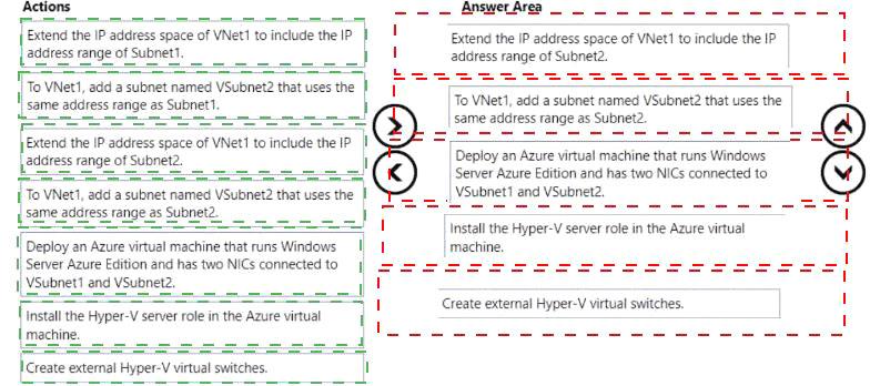 オンプレミスネットワークには、Subnet1 と Subnet2 という 2 つのサブネットがあります。Subnet2 には、VM1 と VM2 という 2 つの仮想マシンを含む Hyper-V ホストが含まれています。VM1 と VM2 は Subnet2 に接続されています。