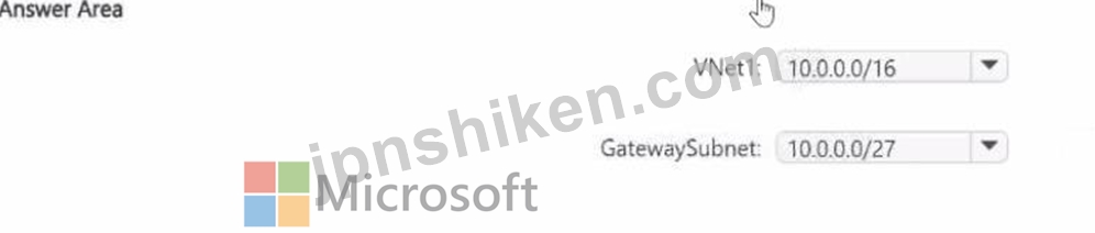 VNet1 と GatewaySubnet に割り当てるアドレス空間はどれですか? 回答するには、回答領域で適切なオプションを選択してください。