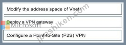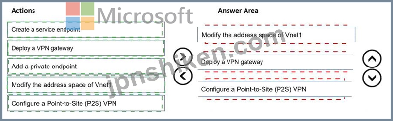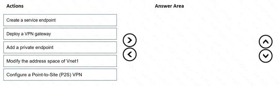 WebApp1 と Vnet1 を統合する前に、どの 3 つのアクションを順番に実行する必要がありますか? 回答するには、適切なアクションをアクション リストから回答領域に移動し、正しい順序に並べます。