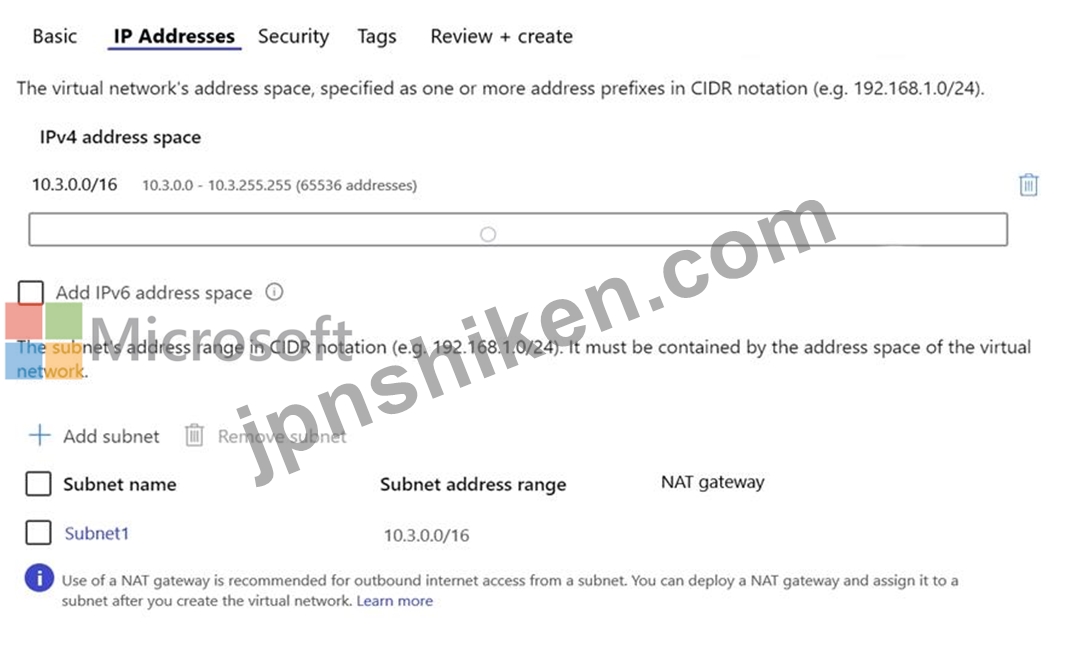 質問1 Azure 仮想ネットワーク内のサブネットの IP アドレス指定を計画...