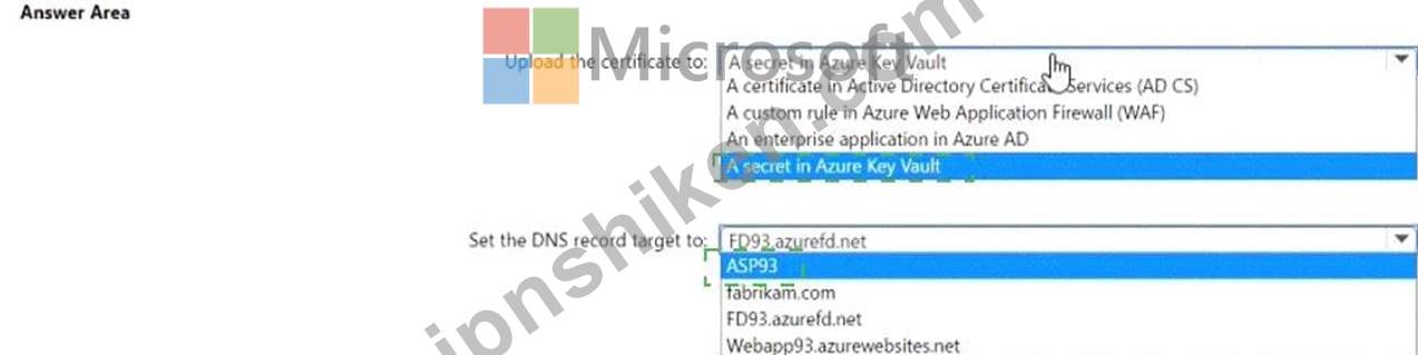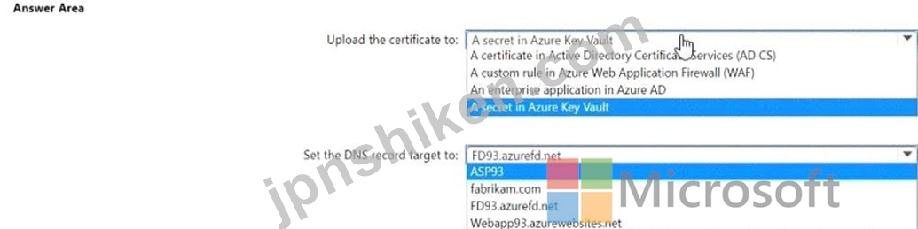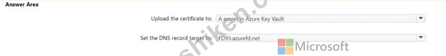 次の表に示すリソースを含む Azure Front Door の展開を計画しています。 ユーザーは、https://www.fabrikarn.com の URL を使用して、Front Door 経由で App Service に接続します。 www.fabfikam.com のホスト名の証明書を取得します。 www.fabrikam.com の DNS レコードを構成し、証明書を Azure にアップロードする必要があります。どうすればよいでしょうか?回答するには、回答エリアで適切な選択肢を選択してください。注: 正解は 1 点です。