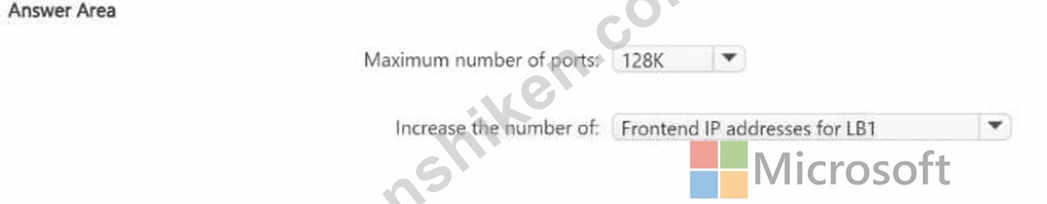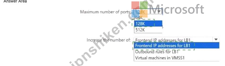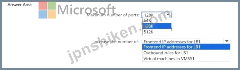 VMSS1 内の仮想マシンで使用できるポートの最大数はいくつですか。また、VMSS1 で使用できる SNAT ポートの最大数を増やすには、何を変更する必要がありますか。回答するには、回答領域で適切なオプションを選択してください。