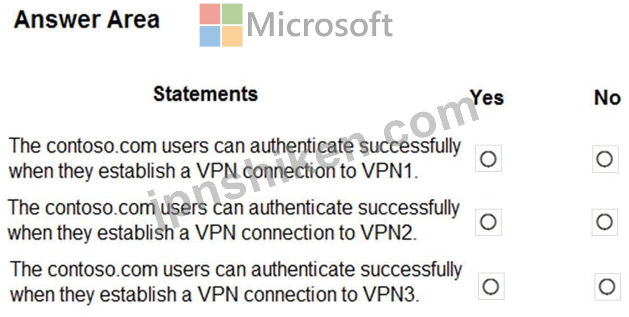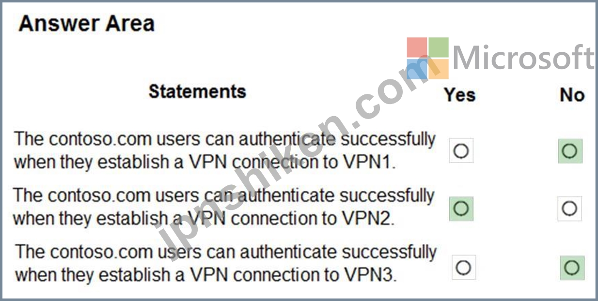 VPN1、VPN2、VPN3はRADIUS認証にNPS1を使用します。contoso.com内のすべてのユーザーはVPN接続を確立できます。