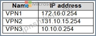 ネットワークには、contoso.com という Active Directory ドメイン サービス (AD DS) ドメインが含まれています。このドメインには、次の表に示す VPN サーバーが含まれています。