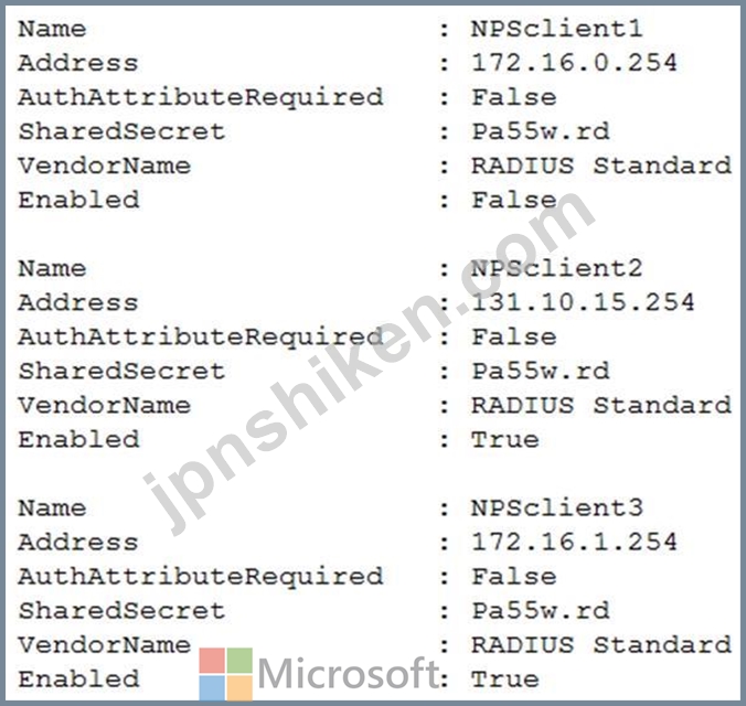 ネットワーク ポリシー サーバー (NPS) がインストールされた NPS1 というサーバーがあります。NPS1 には次の RADIUS クライアントがあります。