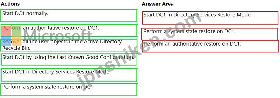 ネットワークには、Active Directory のごみ箱が有効になっている Active Directory ドメイン サービス (AD DS) ドメインが含まれています。ドメインには、DC1 と DC2 という名前の 2 つのドメイン コントローラーが含まれています。ドメイン コントローラーのシステム状態は、Windows Server バックアップを使用して、毎日 23:00 にバックアップされます。