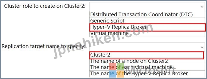 メイン データセンターに Cluster1 という名前の Hyper-V フェールオーバー クラスターがあります。Cluster1 には、Hyper-V サーバーの役割がインストールされている 2 つのノードが含まれています。Cluster1 は、10 台の高可用性仮想マシンをホストします。