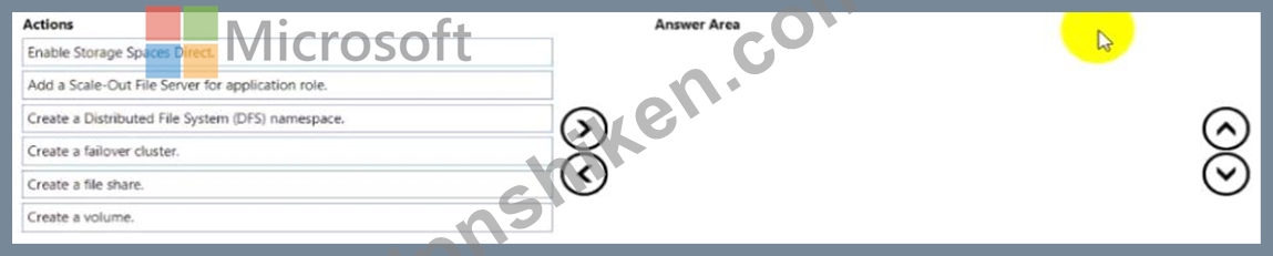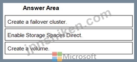 所有している記憶域スペースを使用して、仮想マシンを格納する Hyper-V ハイパーコンバージド クラスターを作成する必要があります。どの 3 つのアクションを順番に実行する必要がありますか? 答えるには、アクションのリストから適切な陰イオンを回答領域に移動し、正しい順序で並べます。