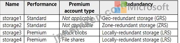 Azure サブスクリプションがあります。サブスクリプションには、Windows Server を実行する VM1 という名前の仮想マシンが含まれています。サブスクリプションには、次の表に示すストレージ アカウントが含まれています。