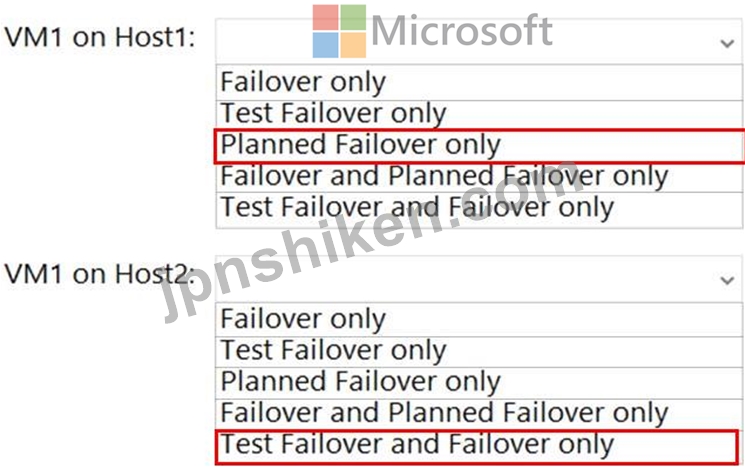 各ホストの VM1 で実行できるフェイルオーバーのタイプはどれですか? 回答するには、回答エリアで適切なオプションを選択します。