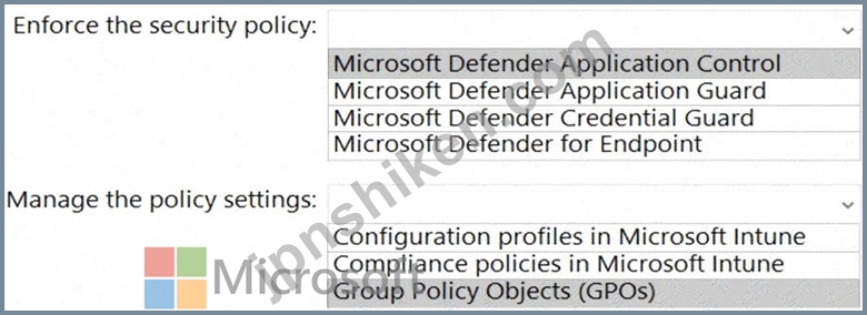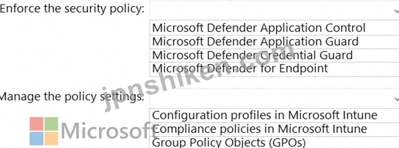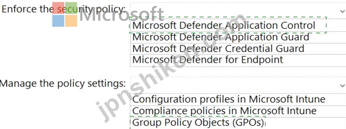 セキュリティ ポリシーを適用するにはどのサービスを使用する必要があり、ポリシー設定を管理するには何を使用する必要がありますか? 回答するには、回答エリアで適切なオプションを選択します。
