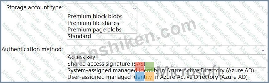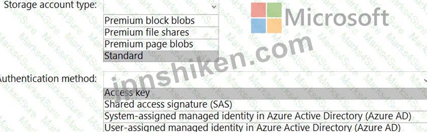 どのストレージ アカウントの種類と認証方法を構成する必要がありますか? 回答するには、回答エリアで適切なオプションを選択します。