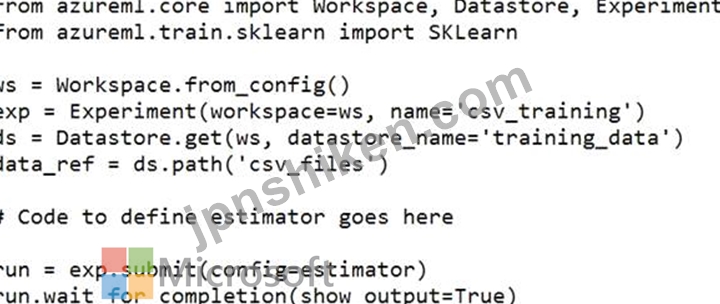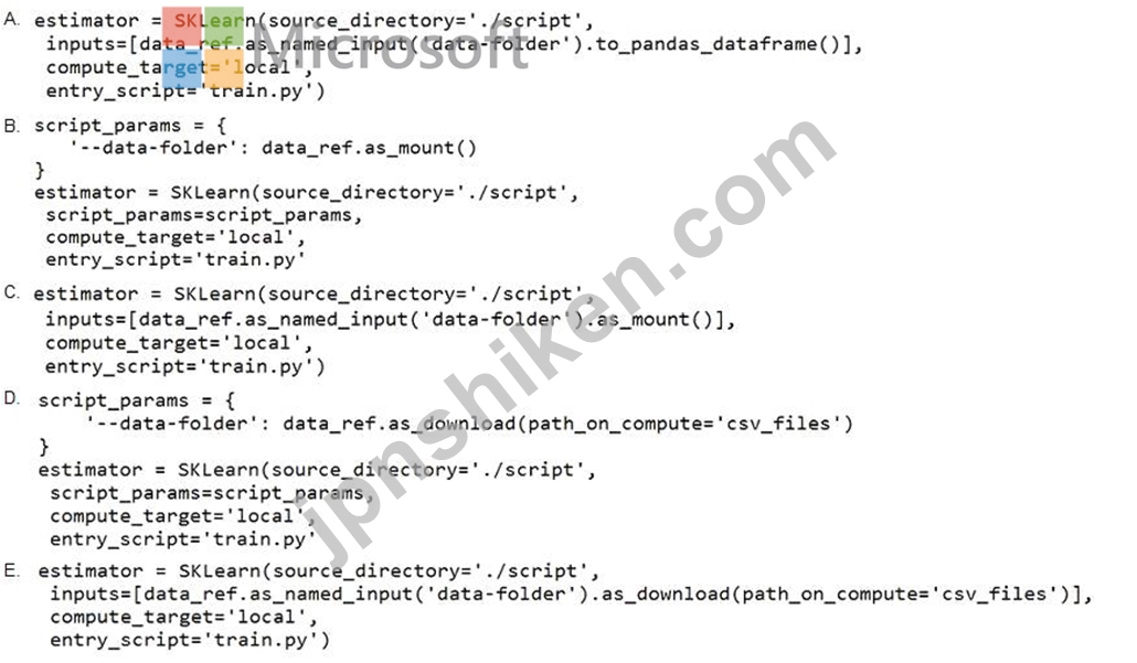 Explanation Besides passing the dataset through the inputs parameter in the estimator, you can also pass the dataset through script_params and get the data path (mounting point) in your training script via arguments. This way, you can keep your training script independent of azureml-sdk. In other words, you will be able use the same training script for local debugging and remote training on any cloud platform. Example: from azureml.train.sklearn import SKLearn script_params = { # mount the dataset on the remote compute and pass the mounted path as an argument to the training script '--data-folder': mnist_ds.as_named_input('mnist').as_mount(), '--regularization': 0.5 } est = SKLearn(source_directory=script_folder, script_params=script_params, compute_target=compute_target, environment_definition=env, entry_script='train_mnist.py') # Run the experiment run = experiment.submit(est) run.wait_for_completion(show_output=True) Reference: https://docs.microsoft.com/es-es/azure/machine-learning/how-to-train-with-datasets