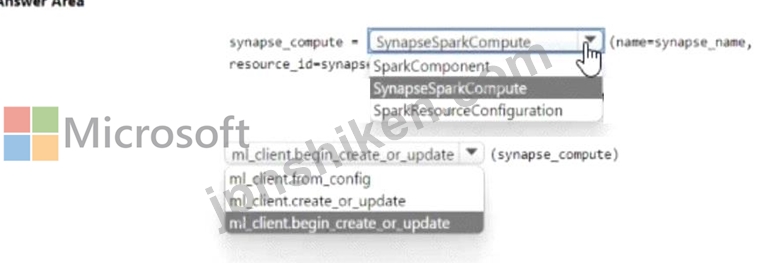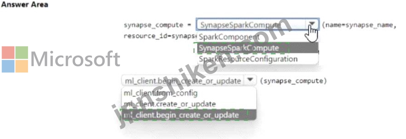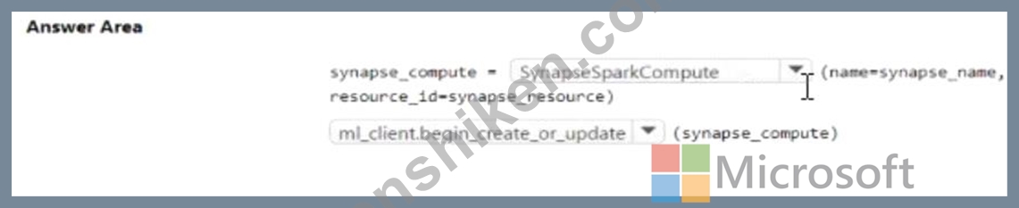 Azure Machine Learning Python SDK v2 を使用して、Synapse Spark プールをワークスペース内で専用コンピューティングとして非同期的に定義および構成する必要があります。乗車セグメントを完了するにはどうすればよいですか? 回答するには、回答領域で適切なオプションを選択してください。