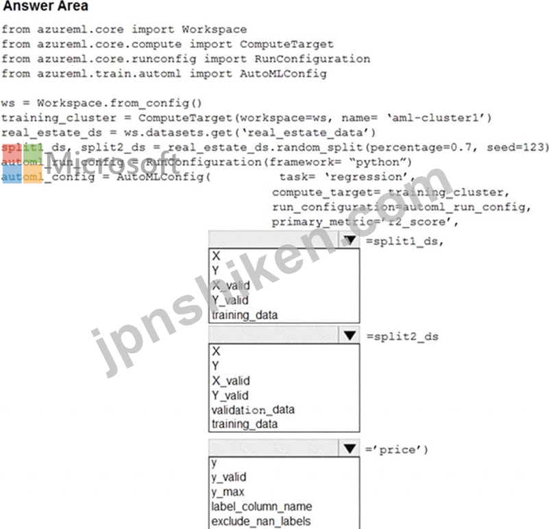 training_data, validation_data = dataset.random_split(percentage=0.8, seed=1) automl_config = AutoMLConfig(compute_target = aml_remote_compute, task = 'classification', primary_metric = 'AUC_weighted', training_data = training_data, validation_data = validation_data, label_column_name = 'Class' ) Box 3: label_column_name label_column_name: