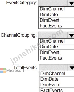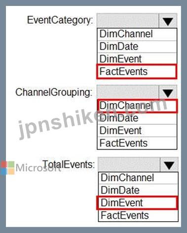 データの分析クエリをサポートするスタースキーマを設計する必要があります。スタースキーマには、日付ディメンションを含む4つのテーブルが含まれます。