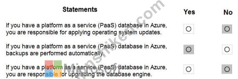 Explanation: Box 1: No Microsoft handles all patching and updating of the SQL and operating system code. You don't have to manage the underlying infrastructure. Box 2: Yes SQL Database is a fully managed service that has built-in high availability, backups, and other common maintenance operations. Box 3: No Reference: https://docs.microsoft.com/en-us/azure/azure-sql/database/sql-database-paas-overview