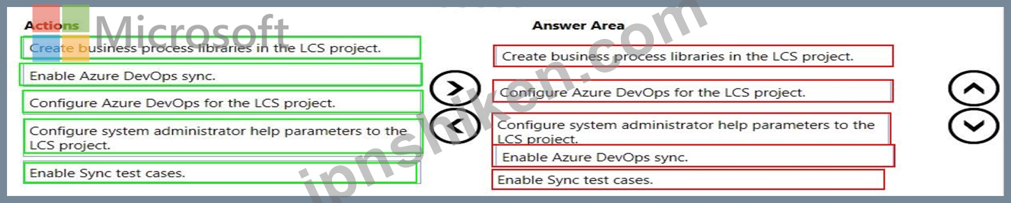 あなたは、ライフサイクルサービス(LCS)プロジェクトのプロジェクトオーナーであり、Dynamics 365 for Finance and Operations環境を展開します。 テスターがビジネスプロセスおよびテスト計画になるプロセスを記録できるように、システムを構成する必要があります。 ユーザー受け入れテスト(UAT)テスト計画を生成するようにシステムを構成する必要があります。 どの順序でアクションを実行する必要がありますか?回答するには、すべてのアクションをアクションのリストから回答エリアに移動し、正しい順序に並べます。
