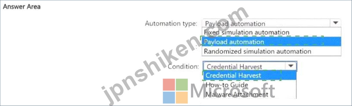 どのようなタイプの自動化を使用する必要がありますか。また、攻撃シミュレーション トレーニングではどのような条件を設定する必要がありますか。回答するには、回答領域で適切なオプションを選択してください。