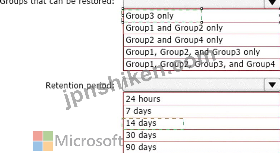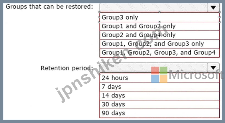 Explanation: Box 1: Group3 only Box 2: 30 days If you've deleted a group, it will be retained for 30 days by default. This 30-day period is considered a "soft- delete" because you can still restore the group. After 30 days, the group and its associated contents are permanently deleted and cannot be restored. Reference: https://learn.microsoft.com/en-us/microsoft-365/admin/create-groups/restore-deleted-group