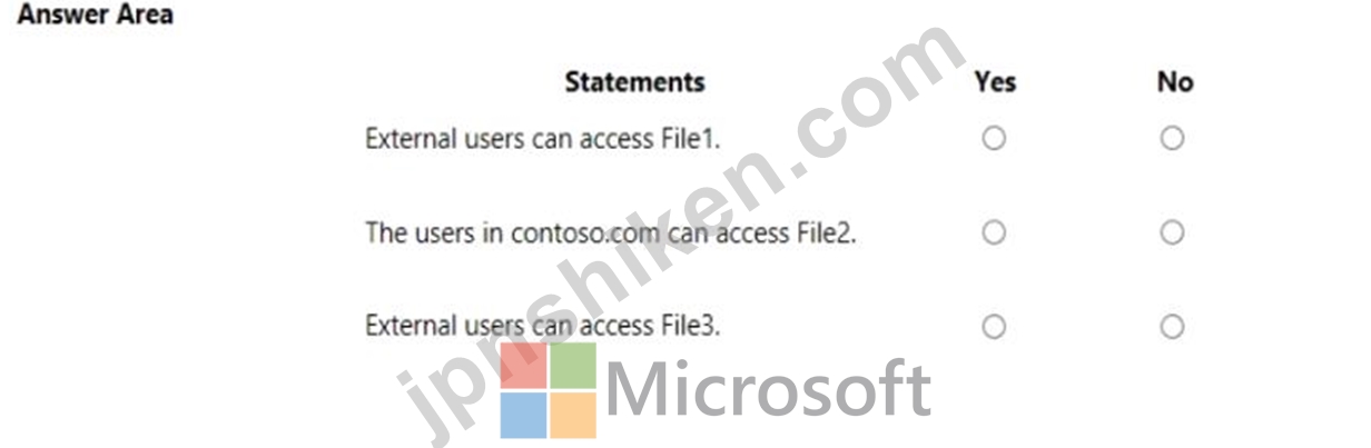 contoso.comという名前のAzure Active Directory(Azure AD)テナントを使用するMicrosoft 365サブスクリプションがあります。 OneDriveは、外部ユーザーと共有されるファイルを保存します。ファイルは、次の表に示すように構成されます。