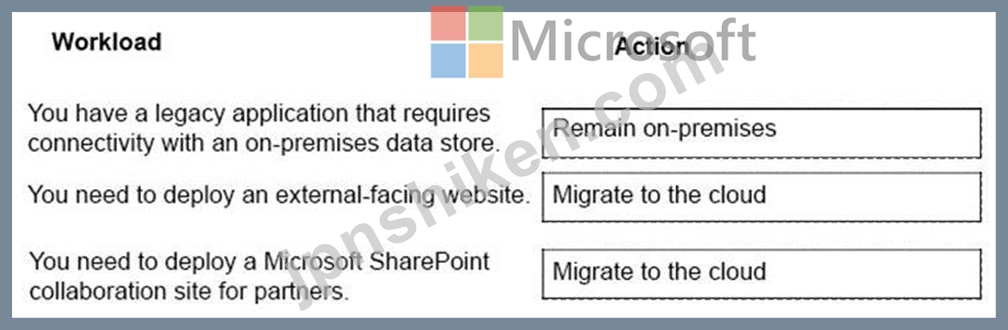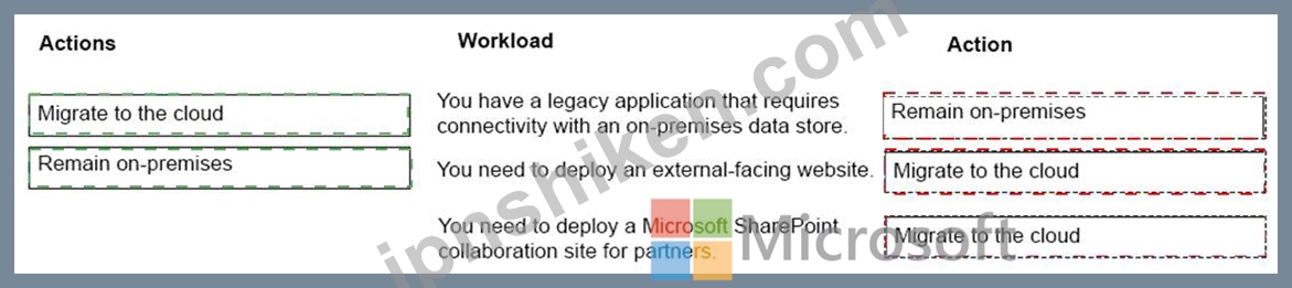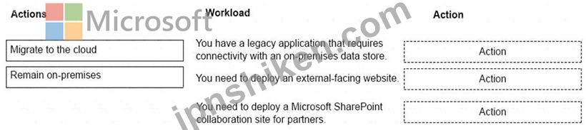どのワークロードをクラウドに移行できますか?答えるには、適切なアクションを正しいワークロードにドラッグします。各アクションは、1回、複数回、またはまったく使用できません。コンテンツを表示するには、ペイン間で分割バーをドラッグするか、スクロールする必要がある場合があります。