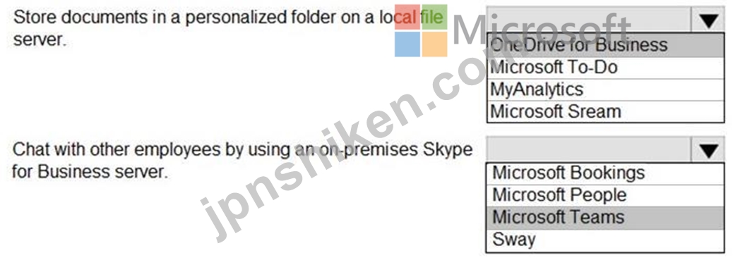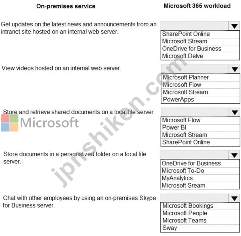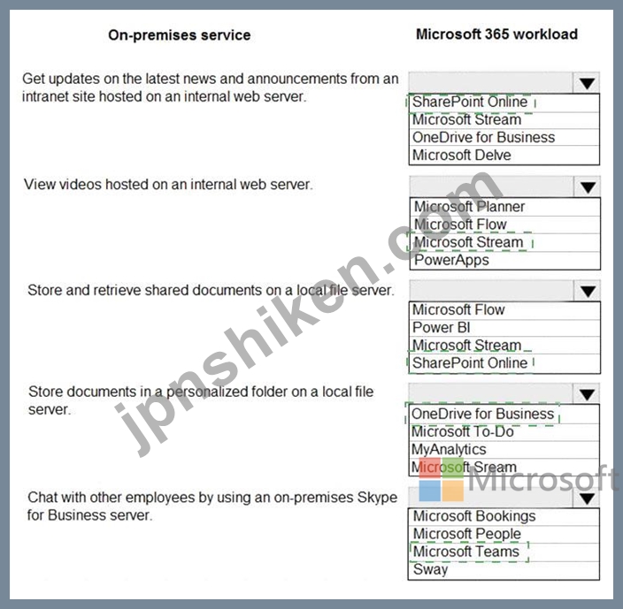 各オンプレミスサービスを置き換えるのに適切なMicrosoft365ワークロードを決定する必要があります。