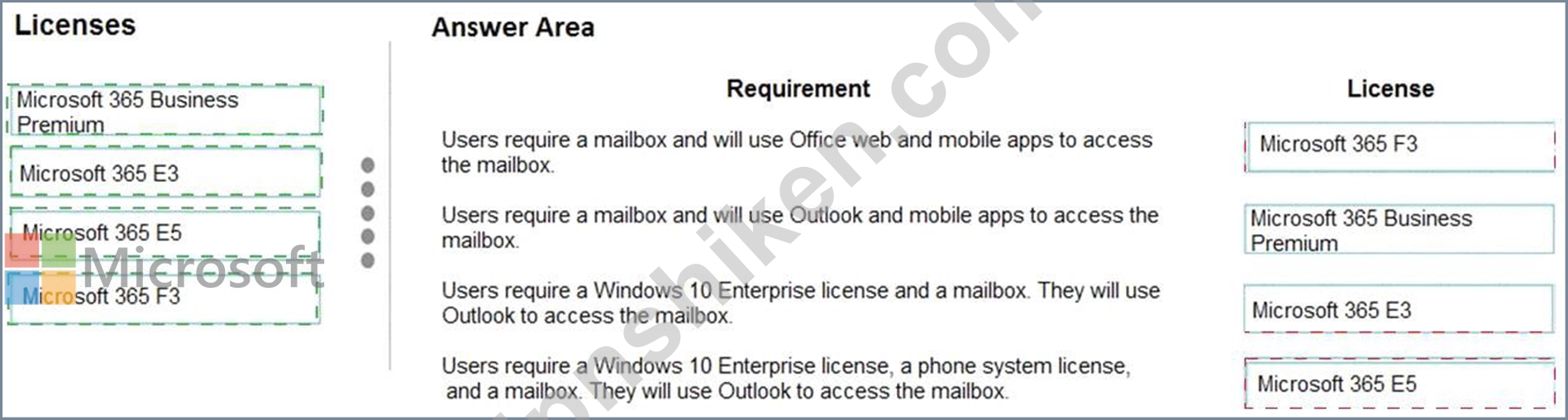 各ライセンスをその要件に一致させます。回答するには、適切なライセンスを左側の列から右側の要件にドラッグします。各ライセンスは、1回使用することも、複数回使用することも、まったく使用しないこともできます。
