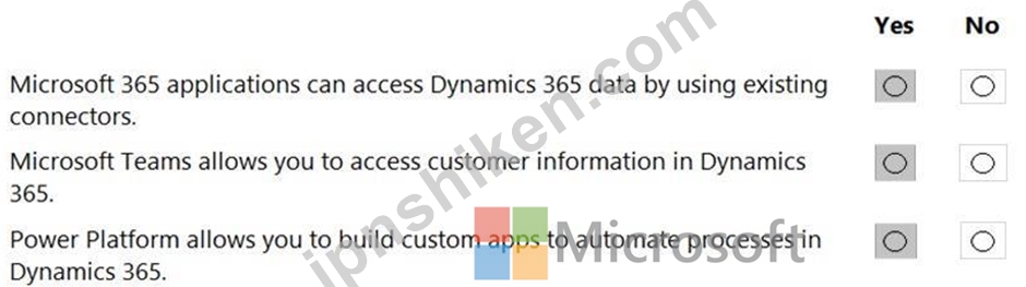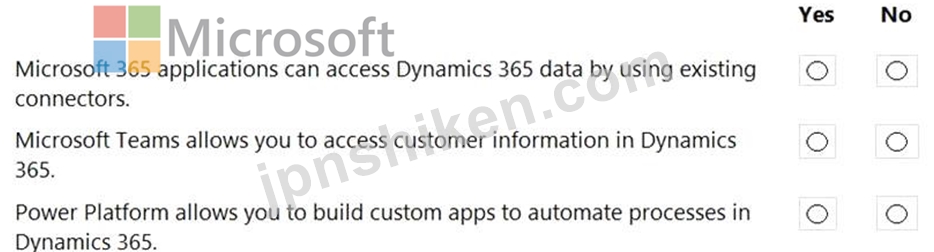 Explanation A screenshot of a computer Description automatically generated with medium confidence Box 1: Yes The Microsoft Dataverse connector is used to connect to Dynamics 365 data Box 2: Yes Microsoft Teams users get license-free access to Dynamics 365 data Box 3: Yes The Microsoft Dataverse connector allows you to connect Power Platform to Dynamic 365 data