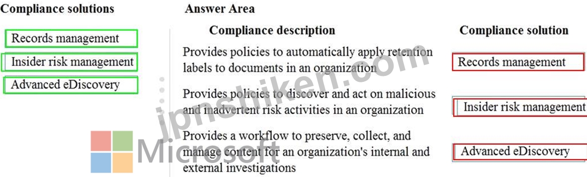 各コンプライアンスソリューションをその説明に一致させます。回答するには、適切なコンプライアンスソリューションを左側の列から右側の説明にドラッグします。各コンプライアンスソリューションは、1回使用することも、複数回使用することも、まったく使用しないこともできます。