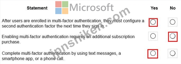 組織にはMicrosoft 365サブスクリプションがあります。多要素認証を実装する予定です。以下の各ステートメントについて、ステートメントが真である場合は「はい」を選択します。それ以外の場合は、「いいえ」を選択します。