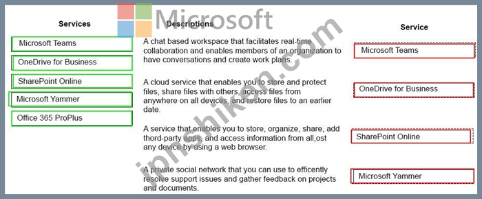 各Microsoft 365サービスを最も適切なサービスの説明と一致させます。答えるには、適切なサービスを正しい説明にドラッグします。各サービスは、1回、複数回、またはまったく使用されません。コンテンツを表示するには、ペイン間で分割バーをドラッグするか、スクロールする必要がある場合があります。
