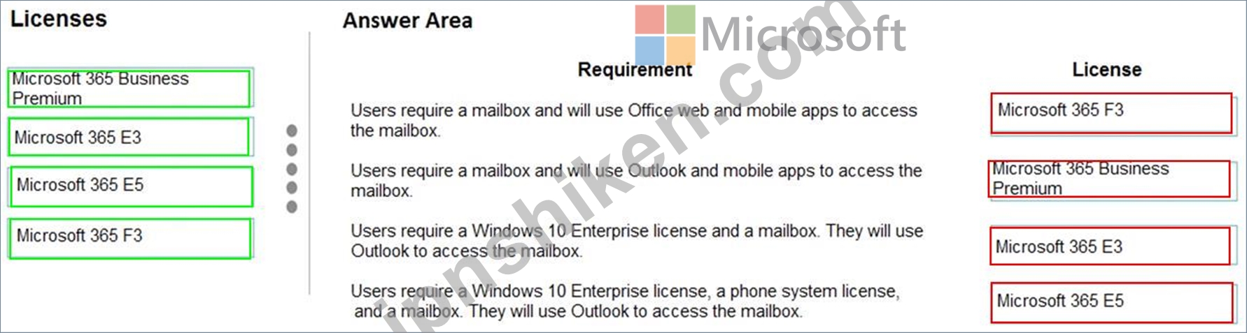 各ライセンスをその要件に一致させます。回答するには、適切なライセンスを左側の列から右側の要件にドラッグします。各ライセンスは、1回使用することも、複数回使用することも、まったく使用しないこともできます。