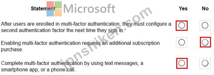 組織にはMicrosoft 365サブスクリプションがあります。多要素認証を実装する予定です。以下の各ステートメントについて、ステートメントが真である場合は「はい」を選択します。それ以外の場合は、「いいえ」を選択します。