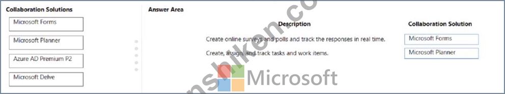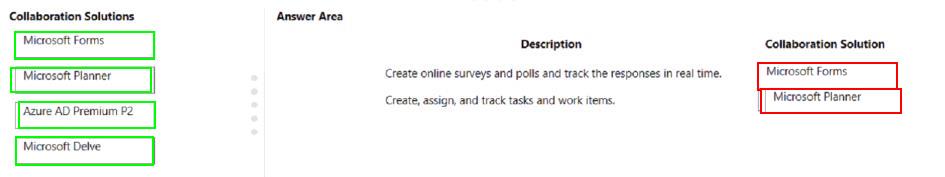 各コラボレーションソリューションをその説明に一致させます。回答するには、適切なコラボレーションソリューションを左側の列から右側の説明にドラッグします。各コラボレーションソリューションは、1回使用することも、複数回使用することも、まったく使用しないこともできます。