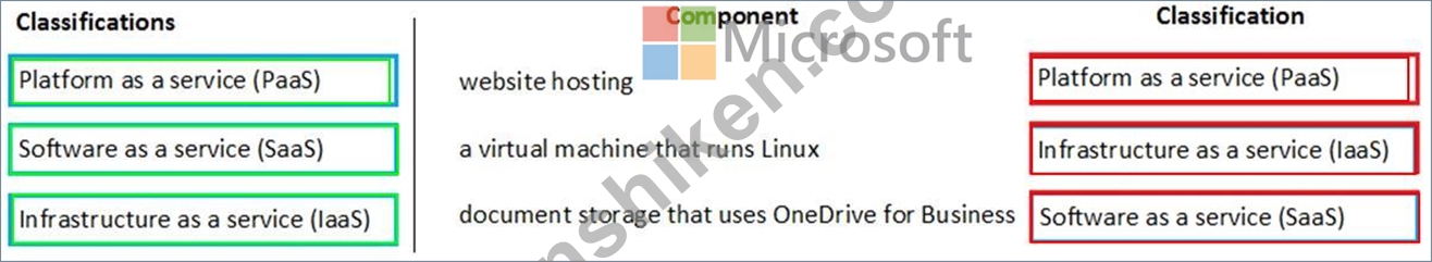 組織は Microsoft Azure と Microsoft 365 に移行しています。 次のコンポーネントを分類する必要があります。 ウェブサイトのホスティング Linux を実行する仮想マシン OneDrive for Business を使用するドキュメント ストレージ 各コンポーネントをその分類に一致させます。回答するには、適切なコンポーネントを左側の列から右側の分類にドラッグします。各コンポーネントは、1 回以上使用することも、まったく使用しないこともできます。 注: それぞれの正しい選択は 1 ポイントの価値があります。
