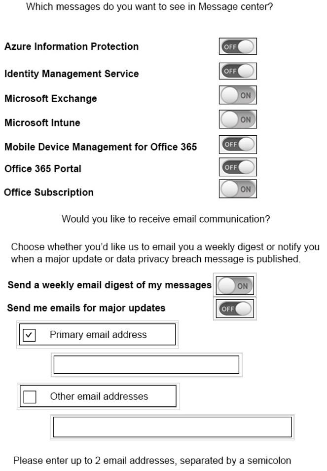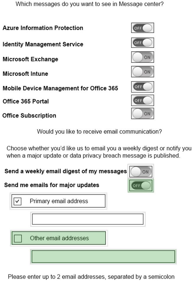 [メッセージ センターの設定を編集] ダイアログ ボックスで選択する必要がある 3 つのオプションはどれですか? 回答するには、回答エリアのダイアログ ボックスで適切な項目を選択します。