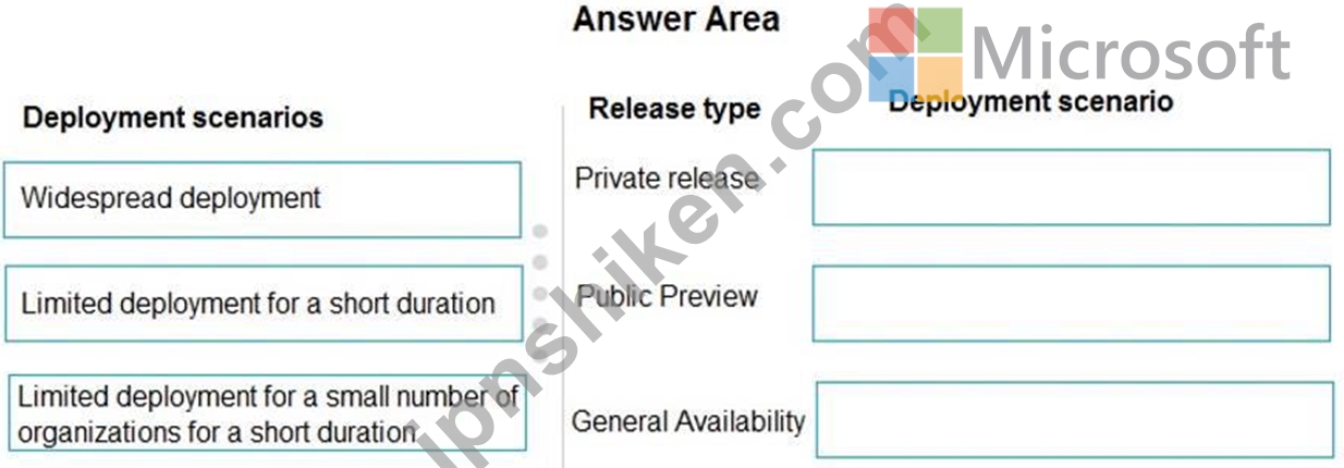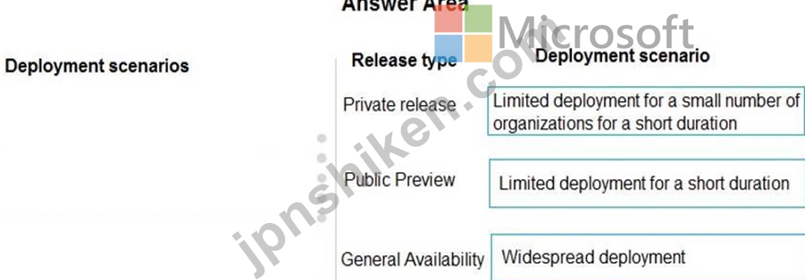 各展開シナリオの適切なリリース タイプを一致させます。答えるには、適切な展開シナリオを正しいリリース タイプにドラッグします。各展開シナリオは、1 回または複数回使用することも、まったく使用しないこともできます。ペイン間の分割バーをドラッグするか、コンテンツを表示するためにスクロールする必要がある場合があります。