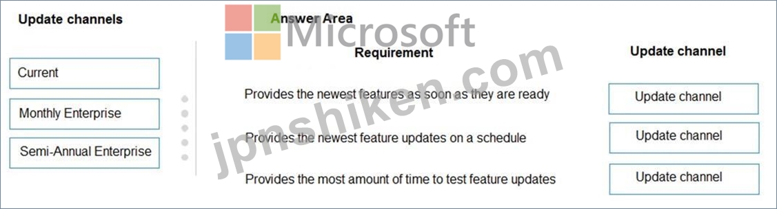 要件ごとにどの更新チャネルを使用する必要がありますか? 答えるには、適切な更新チャネルを正しい要件にドラッグします。各更新チャネルは、1 回以上使用することも、まったく使用しないこともできます。ペイン間の分割バーをドラッグするか、コンテンツを表示するためにスクロールする必要がある場合があります。