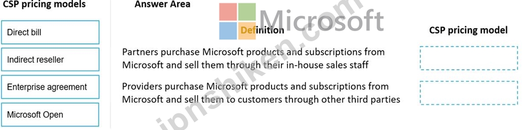 説明: 回答するには、適切な CSP 価格設定モデルを左側の列から右側の定義にドラッグします。各 CSP 価格モデルは、1 回、複数回、またはまったく使用されない場合があります。
