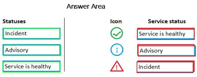 各アイコンに関連付けられているサービス ステータスはどれですか? 答えるには、適切なサービス ステータスを正しいターゲットにドラッグします。各サービス ステータスは、1 回、複数回、またはまったく使用されない場合があります。ペイン間の分割バーをドラッグするか、コンテンツを表示するためにスクロールする必要がある場合があります。