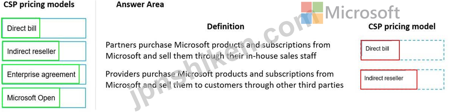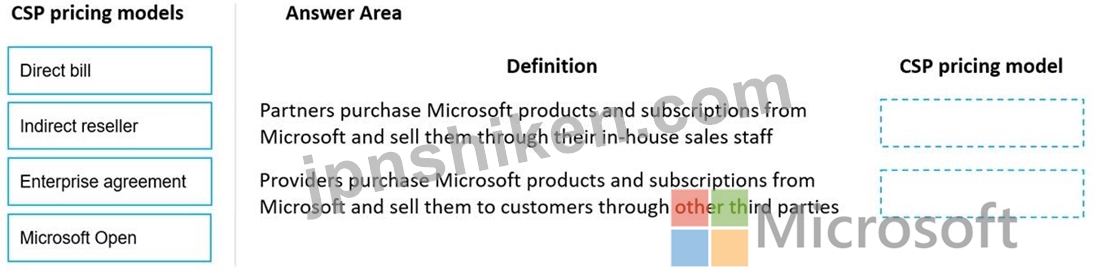 説明: 回答するには、適切な CSP 価格設定モデルを左側の列から右側の定義にドラッグします。各 CSP 価格モデルは、1 回、複数回、またはまったく使用されない場合があります。