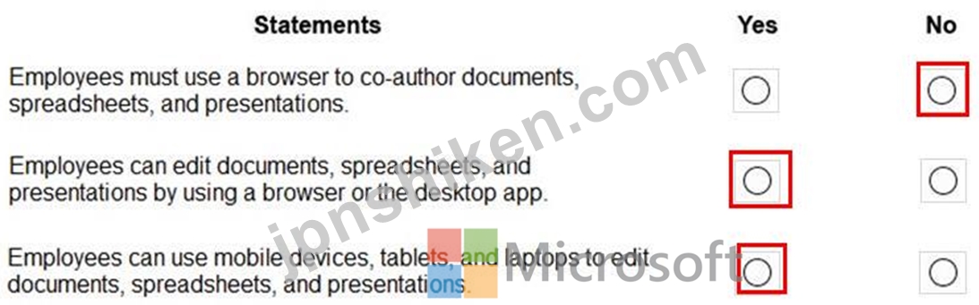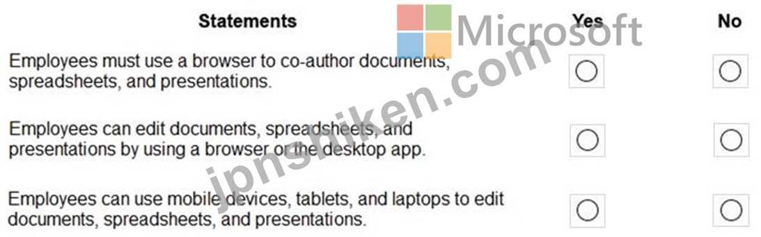 質問100 会社で Office 365 ProPlus を評価しています。 次の各ステート...